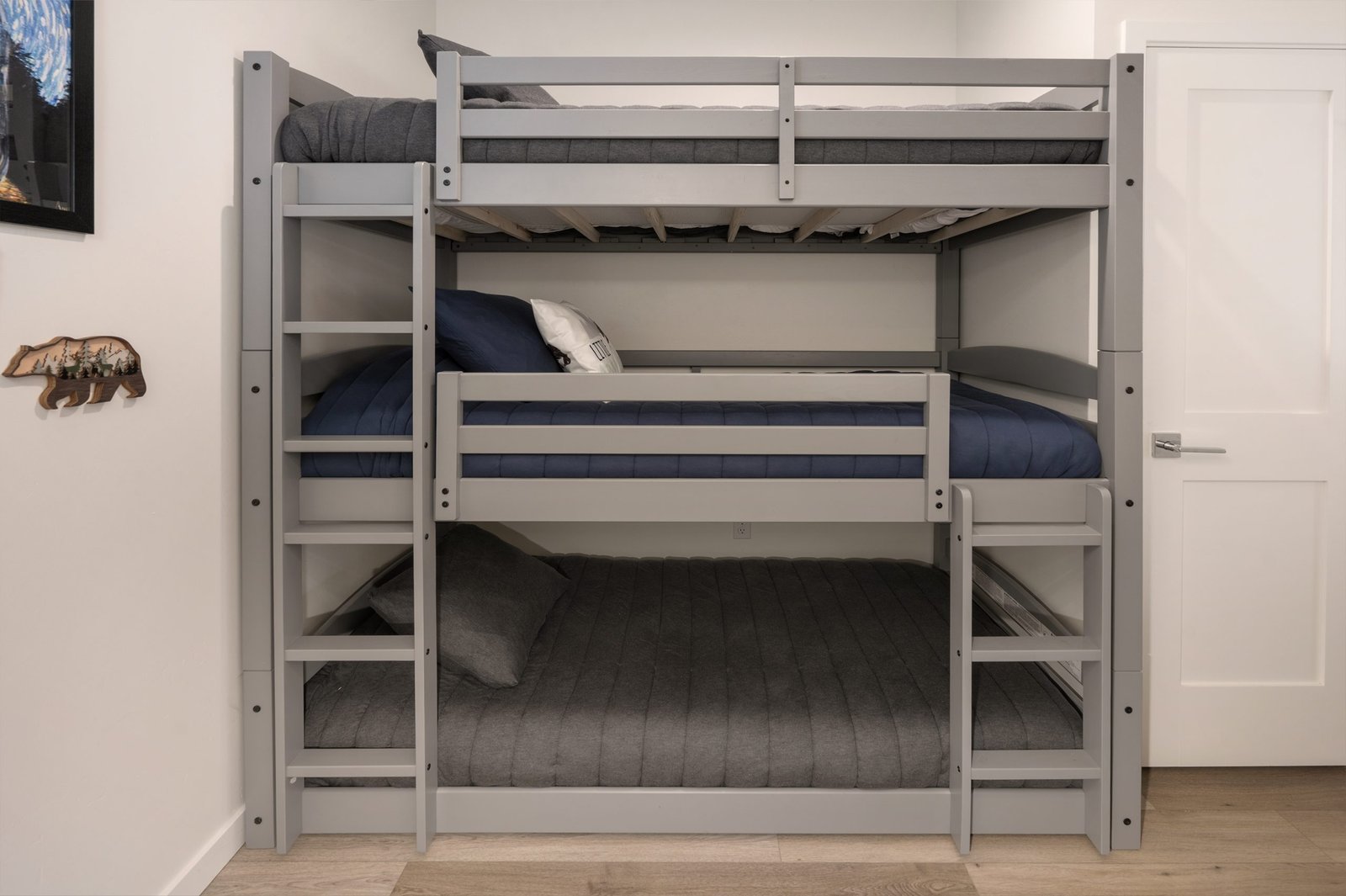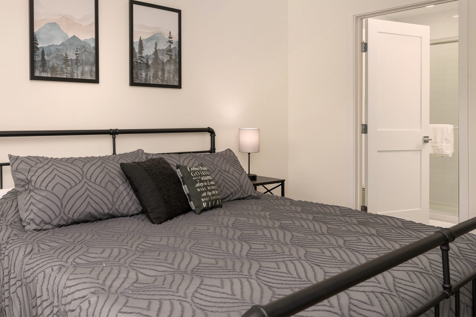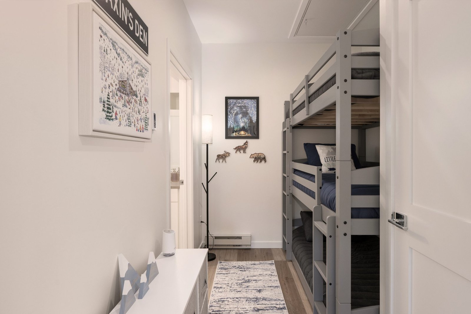 Enjoy modern luxury and rustic charm in our new residence in the heart of the mountains. Perfect for families, adventurers, and those seeking a serene mountain escape. The primary suite has a king bed and en-suite 3/4 bath. The queen bedroom is perfect for quiet reflections. The bunk area is equipped with three cozy bunks, perfect for our younger adventure seekers, giving them their own dedicated space to reflect on the memories of their day.